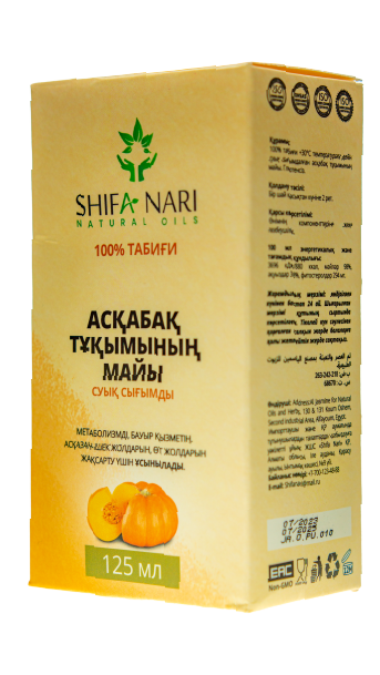 Әдетте, асқабақ тұқымының майы әрқайсысы 0,5 мл өлшемімен 120 капсуласы бар бөтелкемен ұсынылады (барлығы 60 мл май). Бізде бірдей бағаға 125 мл майды аласыз.